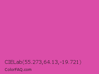 CIELab 55.273,64.13,-19.721 Color is a normal magenta color and the nearest color is Raspberry Pink #e25098. Hex code #db4da8 and RGB value is rgb(219,77,168). In RGB color space, this color is composed of 86% red, 30% green, 66% blue, In CMYK color space, this color is composed of 0% cyan, 65% magenta, 23% yellow , 14% black , In HSL color space, this color has a hue angle of 322° , 66% saturation and 58% lightness.