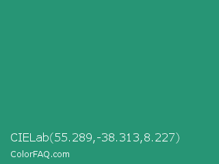 CIELab 55.289,-38.313,8.227 Color is a normal green color and the nearest color is Illuminating Emerald #319177. Hex code #279575 and RGB value is rgb(39,149,117). In RGB color space, this color is composed of 15% red, 58% green, 46% blue, In CMYK color space, this color is composed of 74% cyan, 0% magenta, 21% yellow , 42% black , In HSL color space, this color has a hue angle of 163° , 59% saturation and 37% lightness.