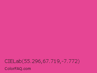 CIELab 55.296,67.719,-7.772 Color is a normal rose color and the nearest color is Raspberry Pink #e25098. Hex code #e64594 and RGB value is rgb(230,69,148). In RGB color space, this color is composed of 90% red, 27% green, 58% blue, In CMYK color space, this color is composed of 0% cyan, 70% magenta, 36% yellow , 10% black , In HSL color space, this color has a hue angle of 331° , 76% saturation and 59% lightness.
