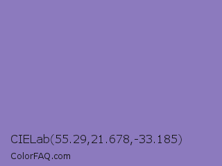 CIELab 55.29,21.678,-33.185 Color is a light indigo color and the nearest color is Ube #8878c3. Hex code #8c7abe and RGB value is rgb(140,122,190). In RGB color space, this color is composed of 55% red, 48% green, 75% blue, In CMYK color space, this color is composed of 26% cyan, 36% magenta, 0% yellow , 25% black , In HSL color space, this color has a hue angle of 256° , 34% saturation and 61% lightness.