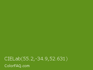 CIELab 55.2,-34.9,52.631 Color is a normal green color and the nearest color is Vida Loca #549019. Hex code #60921b and RGB value is rgb(96,146,27). In RGB color space, this color is composed of 38% red, 57% green, 11% blue, In CMYK color space, this color is composed of 34% cyan, 0% magenta, 82% yellow , 43% black , In HSL color space, this color has a hue angle of 85° , 69% saturation and 34% lightness.