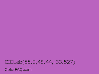 CIELab 55.2,48.44,-33.527 Color is a normal magenta color and the nearest color is Fuchsia Pink #c154c1. Hex code #ba63bf and RGB value is rgb(186,99,191). In RGB color space, this color is composed of 73% red, 39% green, 75% blue, In CMYK color space, this color is composed of 3% cyan, 48% magenta, 0% yellow , 25% black , In HSL color space, this color has a hue angle of 297° , 42% saturation and 57% lightness.