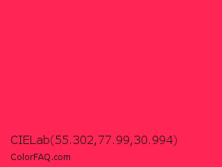 CIELab 55.302,77.99,30.994 Color is a normal red color and the nearest color is Awesome #ff2052. Hex code #ff2554 and RGB value is rgb(255,37,84). In RGB color space, this color is composed of 100% red, 15% green, 33% blue, In CMYK color space, this color is composed of 0% cyan, 85% magenta, 67% yellow , 0% black , In HSL color space, this color has a hue angle of 347° , 100% saturation and 57% lightness.