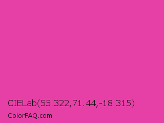 CIELab 55.322,71.44,-18.315 Color is a normal magenta color and the nearest color is Frostbite #e936a7. Hex code #e640a6 and RGB value is rgb(230,64,166). In RGB color space, this color is composed of 90% red, 25% green, 65% blue, In CMYK color space, this color is composed of 0% cyan, 72% magenta, 28% yellow , 10% black , In HSL color space, this color has a hue angle of 323° , 77% saturation and 58% lightness.