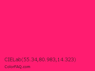 CIELab 55.34,80.983,14.323 Color is a normal rose color and the nearest color is Vivid Raspberry #ff006c. Hex code #ff1c70 and RGB value is rgb(255,28,112). In RGB color space, this color is composed of 100% red, 11% green, 44% blue, In CMYK color space, this color is composed of 0% cyan, 89% magenta, 56% yellow , 0% black , In HSL color space, this color has a hue angle of 338° , 100% saturation and 55% lightness.