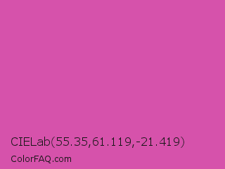 CIELab 55.35,61.119,-21.419 Color is a normal magenta color and the nearest color is Raspberry Pink #e25098. Hex code #d652ab and RGB value is rgb(214,82,171). In RGB color space, this color is composed of 84% red, 32% green, 67% blue, In CMYK color space, this color is composed of 0% cyan, 62% magenta, 20% yellow , 16% black , In HSL color space, this color has a hue angle of 320° , 62% saturation and 58% lightness.