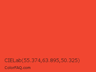 CIELab 55.374,63.895,50.325 Color is a normal red color and the nearest color is Pomegranate #f34723. Hex code #f14630 and RGB value is rgb(241,70,48). In RGB color space, this color is composed of 95% red, 27% green, 19% blue, In CMYK color space, this color is composed of 0% cyan, 71% magenta, 80% yellow , 5% black , In HSL color space, this color has a hue angle of 7° , 87% saturation and 57% lightness.