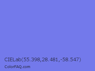 CIELab 55.398,28.481,-58.547 Color is a light blue color and the nearest color is Medium Slate Blue #7b68ee. Hex code #7379eb and RGB value is rgb(115,121,235). In RGB color space, this color is composed of 45% red, 47% green, 92% blue, In CMYK color space, this color is composed of 51% cyan, 49% magenta, 0% yellow , 8% black , In HSL color space, this color has a hue angle of 237° , 75% saturation and 69% lightness.