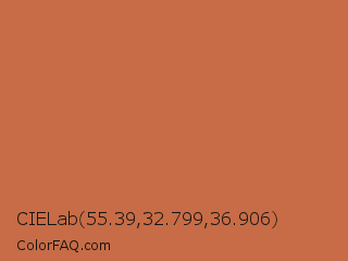 CIELab 55.39,32.799,36.906 Color is a normal orange color and the nearest color is Copper Red #cb6d51. Hex code #c76c46 and RGB value is rgb(199,108,70). In RGB color space, this color is composed of 78% red, 42% green, 27% blue, In CMYK color space, this color is composed of 0% cyan, 46% magenta, 65% yellow , 22% black , In HSL color space, this color has a hue angle of 18° , 54% saturation and 53% lightness.