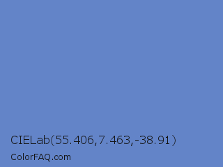 CIELab 55.406,7.463,-38.91 Color is a normal blue color and the nearest color is Silver Lake Blue #5d89ba. Hex code #6384c8 and RGB value is rgb(99,132,200). In RGB color space, this color is composed of 39% red, 52% green, 78% blue, In CMYK color space, this color is composed of 51% cyan, 34% magenta, 0% yellow , 22% black , In HSL color space, this color has a hue angle of 220° , 48% saturation and 59% lightness.