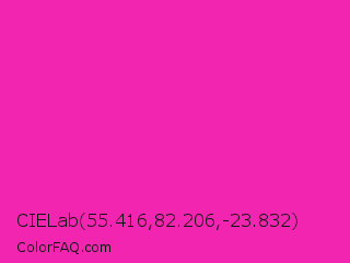 CIELab 55.416,82.206,-23.832 Color is a normal magenta color and the nearest color is Persian Rose #fe28a2. Hex code #f225b0 and RGB value is rgb(242,37,176). In RGB color space, this color is composed of 95% red, 15% green, 69% blue, In CMYK color space, this color is composed of 0% cyan, 85% magenta, 27% yellow , 5% black , In HSL color space, this color has a hue angle of 319° , 89% saturation and 55% lightness.