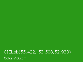 CIELab 55.422,-53.508,52.933 Color is a normal green color and the nearest color is Slimy Green #299617. Hex code #2a9918 and RGB value is rgb(42,153,24). In RGB color space, this color is composed of 16% red, 60% green, 9% blue, In CMYK color space, this color is composed of 73% cyan, 0% magenta, 84% yellow , 40% black , In HSL color space, this color has a hue angle of 112° , 73% saturation and 35% lightness.