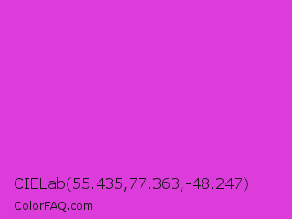 CIELab 55.435,77.363,-48.247 Color is a normal magenta color and the nearest color is Steel Pink #cc33cc. Hex code #db3cda and RGB value is rgb(219,60,218). In RGB color space, this color is composed of 86% red, 24% green, 85% blue, In CMYK color space, this color is composed of 0% cyan, 73% magenta, 0% yellow , 14% black , In HSL color space, this color has a hue angle of 300° , 69% saturation and 55% lightness.