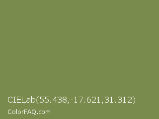 CIELab 55.438,-17.621,31.312 Color is a normal lime color and the nearest color is Palm Leaf #6f9940. Hex code #798c4d and RGB value is rgb(121,140,77). In RGB color space, this color is composed of 47% red, 55% green, 30% blue, In CMYK color space, this color is composed of 14% cyan, 0% magenta, 45% yellow , 45% black , In HSL color space, this color has a hue angle of 78° , 29% saturation and 43% lightness.