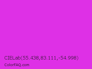 CIELab 55.438,83.111,-54.998 Color is a normal magenta color and the nearest color is Steel Pink #cc33cc. Hex code #de30e6 and RGB value is rgb(222,48,230). In RGB color space, this color is composed of 87% red, 19% green, 90% blue, In CMYK color space, this color is composed of 3% cyan, 79% magenta, 0% yellow , 10% black , In HSL color space, this color has a hue angle of 297° , 78% saturation and 55% lightness.