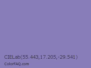 CIELab 55.443,17.205,-29.541 Color is a light indigo color and the nearest color is Ube #8878c3. Hex code #887db8 and RGB value is rgb(136,125,184). In RGB color space, this color is composed of 53% red, 49% green, 72% blue, In CMYK color space, this color is composed of 26% cyan, 32% magenta, 0% yellow , 28% black , In HSL color space, this color has a hue angle of 251° , 29% saturation and 61% lightness.