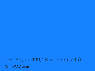 CIELab 55.449,18.204,-69.735 Color is a normal blue color and the nearest color is Blue Crayola #1f75fe. Hex code #1782ff and RGB value is rgb(23,130,255). In RGB color space, this color is composed of 9% red, 51% green, 100% blue, In CMYK color space, this color is composed of 91% cyan, 49% magenta, 0% yellow , 0% black , In HSL color space, this color has a hue angle of 212° , 100% saturation and 55% lightness.
