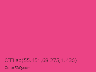 CIELab 55.451,68.275,1.436 Color is a normal rose color and the nearest color is Cerise Pink #ec3b83. Hex code #eb4385 and RGB value is rgb(235,67,133). In RGB color space, this color is composed of 92% red, 26% green, 52% blue, In CMYK color space, this color is composed of 0% cyan, 71% magenta, 43% yellow , 8% black , In HSL color space, this color has a hue angle of 336° , 81% saturation and 59% lightness.
