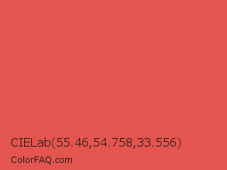 CIELab 55.46,54.758,33.556 Color is a normal red color and the nearest color is Jelly Bean #da614e. Hex code #e3554e and RGB value is rgb(227,85,78). In RGB color space, this color is composed of 89% red, 33% green, 31% blue, In CMYK color space, this color is composed of 0% cyan, 63% magenta, 66% yellow , 11% black , In HSL color space, this color has a hue angle of 3° , 73% saturation and 60% lightness.