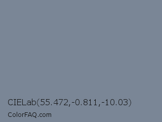 CIELab 55.472,-0.811,-10.03 Color is a normal blue color and the nearest color is Light Slate Gray #778899. Hex code #7a8696 and RGB value is rgb(122,134,150). In RGB color space, this color is composed of 48% red, 53% green, 59% blue, In CMYK color space, this color is composed of 19% cyan, 11% magenta, 0% yellow , 41% black , In HSL color space, this color has a hue angle of 214° , 12% saturation and 53% lightness.