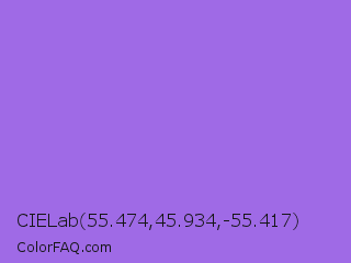 CIELab 55.474,45.934,-55.417 Color is a light violet color and the nearest color is Medium Purple #9370db. Hex code #9f6ae6 and RGB value is rgb(159,106,230). In RGB color space, this color is composed of 62% red, 42% green, 90% blue, In CMYK color space, this color is composed of 31% cyan, 54% magenta, 0% yellow , 10% black , In HSL color space, this color has a hue angle of 266° , 71% saturation and 66% lightness.