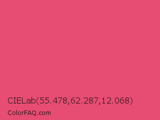 CIELab 55.478,62.287,12.068 Color is a normal red color and the nearest color is Cranberry #db5079. Hex code #e74c73 and RGB value is rgb(231,76,115). In RGB color space, this color is composed of 91% red, 30% green, 45% blue, In CMYK color space, this color is composed of 0% cyan, 67% magenta, 50% yellow , 9% black , In HSL color space, this color has a hue angle of 345° , 76% saturation and 60% lightness.