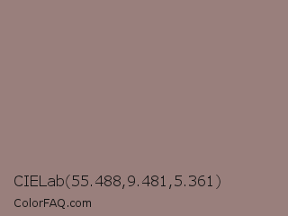 CIELab 55.488,9.481,5.361 Color is a normal red color and the nearest color is Cinereous #98817b. Hex code #997f7c and RGB value is rgb(153,127,124). In RGB color space, this color is composed of 60% red, 50% green, 49% blue, In CMYK color space, this color is composed of 0% cyan, 17% magenta, 19% yellow , 40% black , In HSL color space, this color has a hue angle of 6° , 12% saturation and 54% lightness.