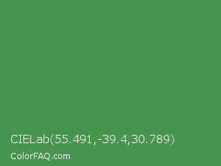 CIELab 55.491,-39.4,30.789 Color is a normal green color and the nearest color is May Green #4c9141. Hex code #48954d and RGB value is rgb(72,149,77). In RGB color space, this color is composed of 28% red, 58% green, 30% blue, In CMYK color space, this color is composed of 52% cyan, 0% magenta, 48% yellow , 42% black , In HSL color space, this color has a hue angle of 124° , 35% saturation and 43% lightness.
