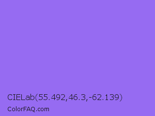 CIELab 55.492,46.3,-62.139 Color is a light indigo color and the nearest color is Navy Purple #9457eb. Hex code #966bf2 and RGB value is rgb(150,107,242). In RGB color space, this color is composed of 59% red, 42% green, 95% blue, In CMYK color space, this color is composed of 38% cyan, 56% magenta, 0% yellow , 5% black , In HSL color space, this color has a hue angle of 259° , 84% saturation and 68% lightness.