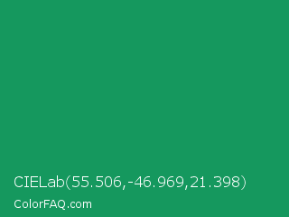 CIELab 55.506,-46.969,21.398 Color is a normal green color and the nearest color is Shamrock Green #009e60. Hex code #15985e and RGB value is rgb(21,152,94). In RGB color space, this color is composed of 8% red, 60% green, 37% blue, In CMYK color space, this color is composed of 86% cyan, 0% magenta, 38% yellow , 40% black , In HSL color space, this color has a hue angle of 153° , 76% saturation and 34% lightness.