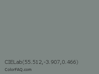 CIELab 55.512,-3.907,0.466 Color is a normal green color and the nearest color is Gunsmoke #828685. Hex code #7e8784 and RGB value is rgb(126,135,132). In RGB color space, this color is composed of 49% red, 53% green, 52% blue, In CMYK color space, this color is composed of 7% cyan, 0% magenta, 2% yellow , 47% black , In HSL color space, this color has a hue angle of 160° , 4% saturation and 51% lightness.