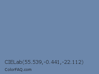 CIELab 55.539,-0.441,-22.112 Color is a normal blue color and the nearest color is Bermuda Gray #6b8ba2. Hex code #6c87ab and RGB value is rgb(108,135,171). In RGB color space, this color is composed of 42% red, 53% green, 67% blue, In CMYK color space, this color is composed of 37% cyan, 21% magenta, 0% yellow , 33% black , In HSL color space, this color has a hue angle of 214° , 27% saturation and 55% lightness.