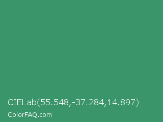 CIELab 55.548,-37.284,14.897 Color is a normal green color and the nearest color is Illuminating Emerald #319177. Hex code #3b956a and RGB value is rgb(59,149,106). In RGB color space, this color is composed of 23% red, 58% green, 42% blue, In CMYK color space, this color is composed of 60% cyan, 0% magenta, 29% yellow , 42% black , In HSL color space, this color has a hue angle of 151° , 43% saturation and 41% lightness.