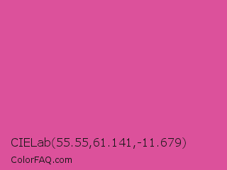 CIELab 55.55,61.141,-11.679 Color is a normal rose color and the nearest color is Raspberry Pink #e25098. Hex code #dc519b and RGB value is rgb(220,81,155). In RGB color space, this color is composed of 86% red, 32% green, 61% blue, In CMYK color space, this color is composed of 0% cyan, 63% magenta, 30% yellow , 14% black , In HSL color space, this color has a hue angle of 328° , 67% saturation and 59% lightness.