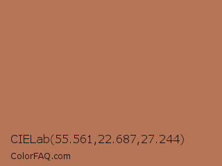 CIELab 55.561,22.687,27.244 Color is a normal orange color and the nearest color is Santa Fe #b16d52. Hex code #b77557 and RGB value is rgb(183,117,87). In RGB color space, this color is composed of 72% red, 46% green, 34% blue, In CMYK color space, this color is composed of 0% cyan, 36% magenta, 52% yellow , 28% black , In HSL color space, this color has a hue angle of 19° , 40% saturation and 53% lightness.