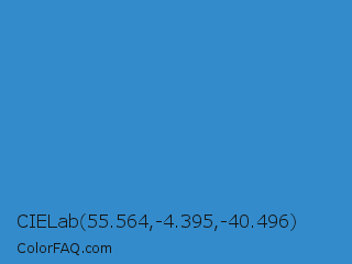 CIELab 55.564,-4.395,-40.496 Color is a normal blue color and the nearest color is Curious Blue #2596d1. Hex code #338bcb and RGB value is rgb(51,139,203). In RGB color space, this color is composed of 20% red, 55% green, 80% blue, In CMYK color space, this color is composed of 75% cyan, 32% magenta, 0% yellow , 20% black , In HSL color space, this color has a hue angle of 205° , 60% saturation and 50% lightness.