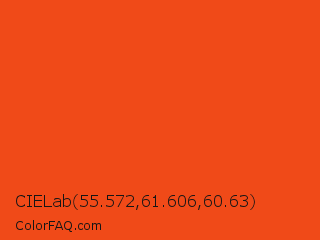CIELab 55.572,61.606,60.63 Color is a normal red color and the nearest color is Pomegranate #f34723. Hex code #f04a18 and RGB value is rgb(240,74,24). In RGB color space, this color is composed of 94% red, 29% green, 9% blue, In CMYK color space, this color is composed of 0% cyan, 69% magenta, 90% yellow , 6% black , In HSL color space, this color has a hue angle of 14° , 88% saturation and 52% lightness.