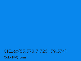 CIELab 55.578,7.726,-59.574 Color is a normal blue color and the nearest color is Azure Radiance #007fff. Hex code #0887ed and RGB value is rgb(8,135,237). In RGB color space, this color is composed of 3% red, 53% green, 93% blue, In CMYK color space, this color is composed of 97% cyan, 43% magenta, 0% yellow , 7% black , In HSL color space, this color has a hue angle of 207° , 93% saturation and 48% lightness.