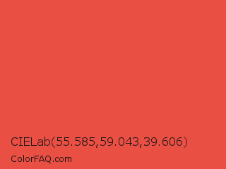 CIELab 55.585,59.043,39.606 Color is a normal red color and the nearest color is Carmine Pink #eb4c42. Hex code #ea4f44 and RGB value is rgb(234,79,68). In RGB color space, this color is composed of 92% red, 31% green, 27% blue, In CMYK color space, this color is composed of 0% cyan, 66% magenta, 71% yellow , 8% black , In HSL color space, this color has a hue angle of 4° , 80% saturation and 59% lightness.