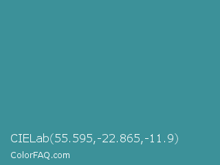 CIELab 55.595,-22.865,-11.9 Color is a normal cyan color and the nearest color is Astral #327da0. Hex code #3c9199 and RGB value is rgb(60,145,153). In RGB color space, this color is composed of 24% red, 57% green, 60% blue, In CMYK color space, this color is composed of 61% cyan, 5% magenta, 0% yellow , 40% black , In HSL color space, this color has a hue angle of 185° , 44% saturation and 42% lightness.