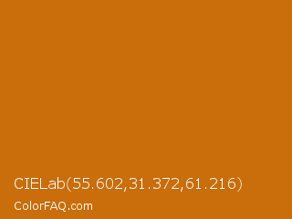 CIELab 55.602,31.372,61.216 Color is a normal orange color and the nearest color is Indochine #c26b03. Hex code #ca6d0b and RGB value is rgb(202,109,11). In RGB color space, this color is composed of 79% red, 43% green, 4% blue, In CMYK color space, this color is composed of 0% cyan, 46% magenta, 95% yellow , 21% black , In HSL color space, this color has a hue angle of 31° , 90% saturation and 42% lightness.