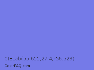 CIELab 55.611,27.4,-56.523 Color is a light blue color and the nearest color is Medium Slate Blue #7b68ee. Hex code #757ae8 and RGB value is rgb(117,122,232). In RGB color space, this color is composed of 46% red, 48% green, 91% blue, In CMYK color space, this color is composed of 50% cyan, 47% magenta, 0% yellow , 9% black , In HSL color space, this color has a hue angle of 237° , 71% saturation and 68% lightness.