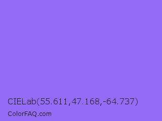 CIELab 55.611,47.168,-64.737 Color is a light indigo color and the nearest color is Navy Purple #9457eb. Hex code #946bf7 and RGB value is rgb(148,107,247). In RGB color space, this color is composed of 58% red, 42% green, 97% blue, In CMYK color space, this color is composed of 40% cyan, 57% magenta, 0% yellow , 3% black , In HSL color space, this color has a hue angle of 258° , 90% saturation and 69% lightness.
