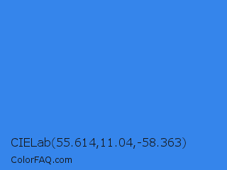 CIELab 55.614,11.04,-58.363 Color is a normal blue color and the nearest color is Bleu De France #318ce7. Hex code #3585eb and RGB value is rgb(53,133,235). In RGB color space, this color is composed of 21% red, 52% green, 92% blue, In CMYK color space, this color is composed of 77% cyan, 43% magenta, 0% yellow , 8% black , In HSL color space, this color has a hue angle of 214° , 82% saturation and 56% lightness.