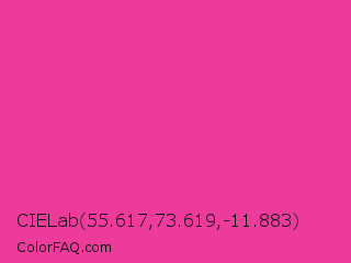 CIELab 55.617,73.619,-11.883 Color is a normal magenta color and the nearest color is Frostbite #e936a7. Hex code #ed3b9c and RGB value is rgb(237,59,156). In RGB color space, this color is composed of 93% red, 23% green, 61% blue, In CMYK color space, this color is composed of 0% cyan, 75% magenta, 34% yellow , 7% black , In HSL color space, this color has a hue angle of 327° , 83% saturation and 58% lightness.