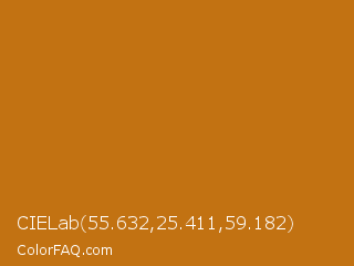 CIELab 55.632,25.411,59.182 Color is a normal orange color and the nearest color is Bourbon #ba6f1e. Hex code #c27212 and RGB value is rgb(194,114,18). In RGB color space, this color is composed of 76% red, 45% green, 7% blue, In CMYK color space, this color is composed of 0% cyan, 41% magenta, 91% yellow , 24% black , In HSL color space, this color has a hue angle of 33° , 83% saturation and 42% lightness.