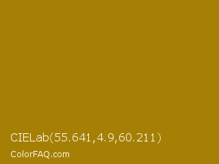 CIELab 55.641,4.9,60.211 Color is a normal yellow color and the nearest color is Hot Toddy #b38007. Hex code #a68005 and RGB value is rgb(166,128,5). In RGB color space, this color is composed of 65% red, 50% green, 2% blue, In CMYK color space, this color is composed of 0% cyan, 23% magenta, 97% yellow , 35% black , In HSL color space, this color has a hue angle of 46° , 94% saturation and 34% lightness.
