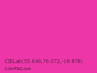 CIELab 55.649,76.072,-18.878 Color is a normal magenta color and the nearest color is Frostbite #e936a7. Hex code #ed37a8 and RGB value is rgb(237,55,168). In RGB color space, this color is composed of 93% red, 22% green, 66% blue, In CMYK color space, this color is composed of 0% cyan, 77% magenta, 29% yellow , 7% black , In HSL color space, this color has a hue angle of 323° , 83% saturation and 57% lightness.