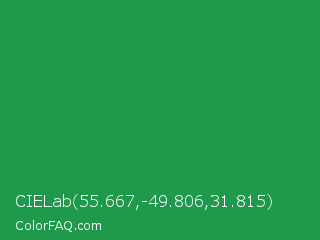 CIELab 55.667,-49.806,31.815 Color is a normal green color and the nearest color is Eucalyptus #278a5b. Hex code #1f994b and RGB value is rgb(31,153,75). In RGB color space, this color is composed of 12% red, 60% green, 29% blue, In CMYK color space, this color is composed of 80% cyan, 0% magenta, 51% yellow , 40% black , In HSL color space, this color has a hue angle of 142° , 66% saturation and 36% lightness.