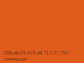 CIELab 55.675,48.717,57.751 Color is a normal orange color and the nearest color is Flame #e25822. Hex code #e05c1d and RGB value is rgb(224,92,29). In RGB color space, this color is composed of 88% red, 36% green, 11% blue, In CMYK color space, this color is composed of 0% cyan, 59% magenta, 87% yellow , 12% black , In HSL color space, this color has a hue angle of 19° , 77% saturation and 50% lightness.